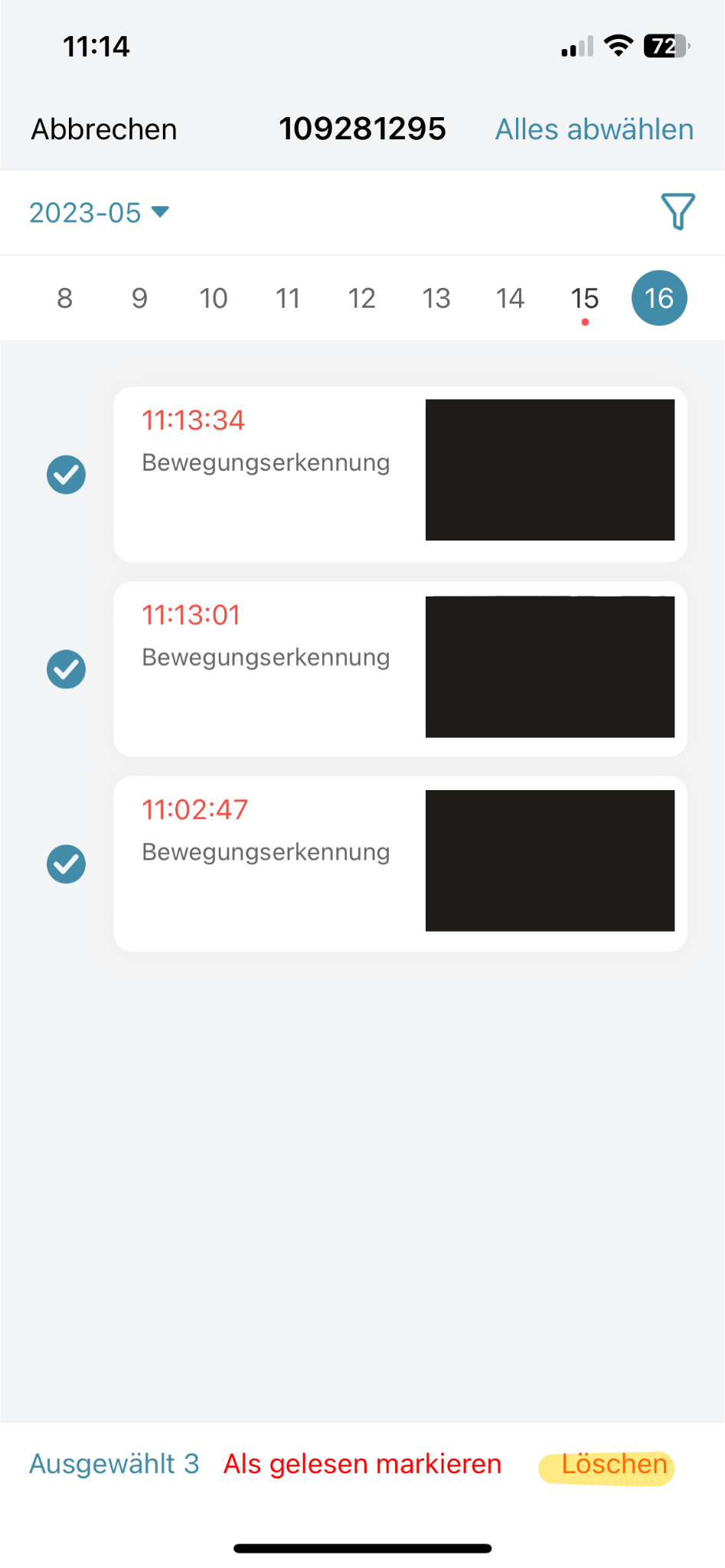 Wenn du aufgenommene Bilder löschen möchtest, dann ist dies über die App möglich. Dafür markierst du die Bilder, die du löschen möchtest, und tippst unten rechts auf "löschen."