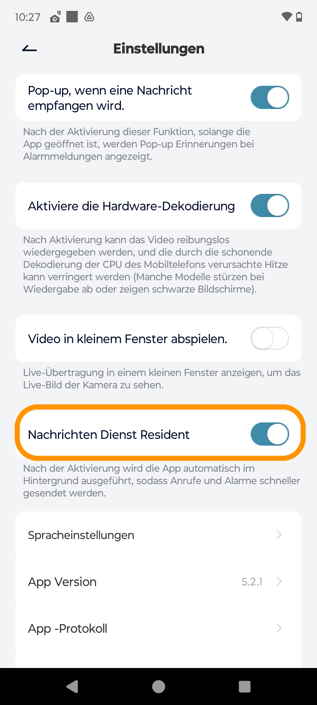 6.2 Aktiviere nun in den Einstellungen die "Nachrichten Dienst Resident"! Anchließend erhältst du die Push-Benachrichtigungen der PetTec Snoop Cube App!