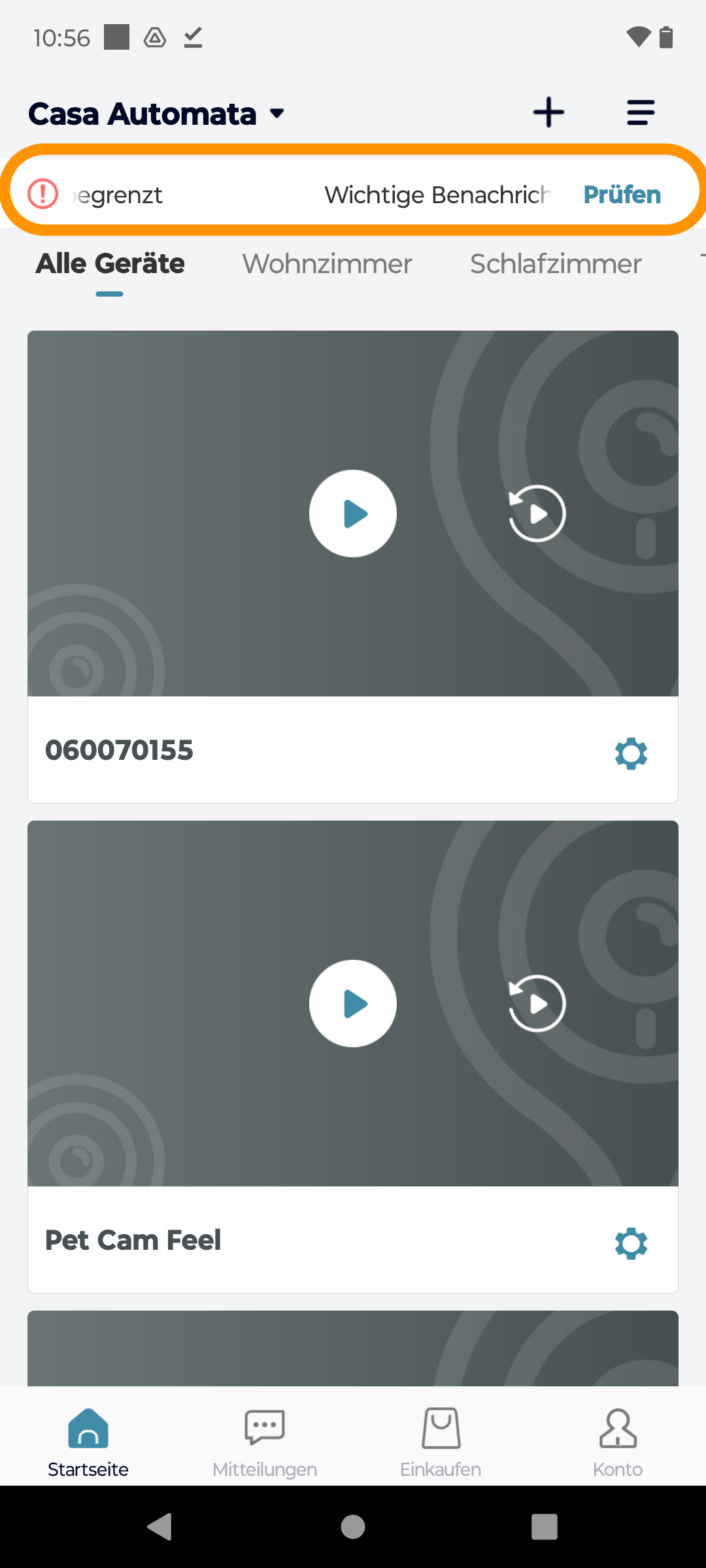 1. Nach der Erstinstallation der App und initialen Anmeldung kommt der User auf die Hauptübersichtsseite der PetTec Snoop Cube App. Im oberen Feld wird eine Benachrichtigung mit einem roten, eingekreisten Ausrufezeichen angezeigt. Bitte drücke nun auf "Prüfen" und folge den weiteren Schritten