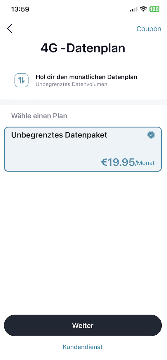 2. Wähle nun den Service "Unbegrenztes Datenpaket" aus