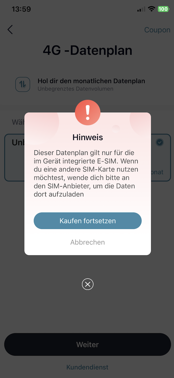 3. Es erscheint ein Hinweis, nachdem fortgefahren wurden. Der Hinweis besagt lediglich, dass der gebuchte PetTec 4G/LTE-Service nur mit dieser Kamera funktioniert und mit keiner anderen Kamera verwendet werden kann.