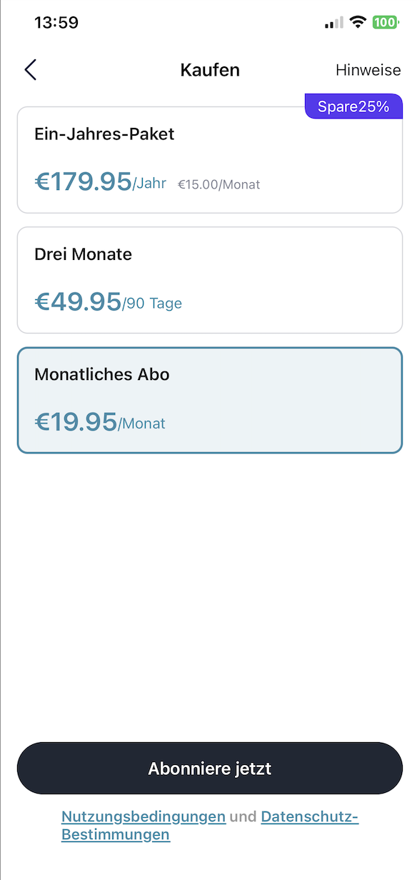 4. Wähle das Laufzeitpaket deiner Wahl aus! Wählst du die monatliche Zahlungsweise, dann buchst du ein Abo, das sich automatisch im einen Monat verlängert, solange es nicht gekündigt wurde. Die Kündigung erfolgt wie bei den PetTec Cloud+ Services über die Zahlungsmethode (AppStore, PlayStore oder PayPal).
