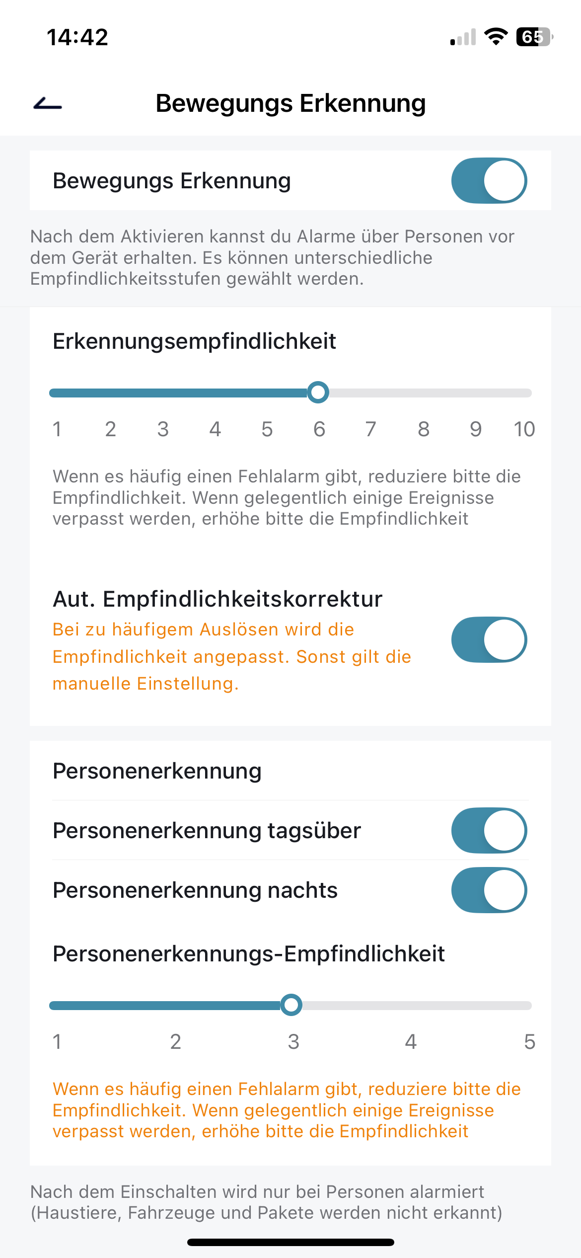 Auto. Empfindlichkeitskorrektur: Reguliert die eingestellte Erkennungsempfindlichkeit nach unten, sollte auffällig oft die Bewegungserkennung ausgelöst werden. Gilt natürlich nur, wenn die Empfindlichkeitskorrektur von dir aktiviert wurde.