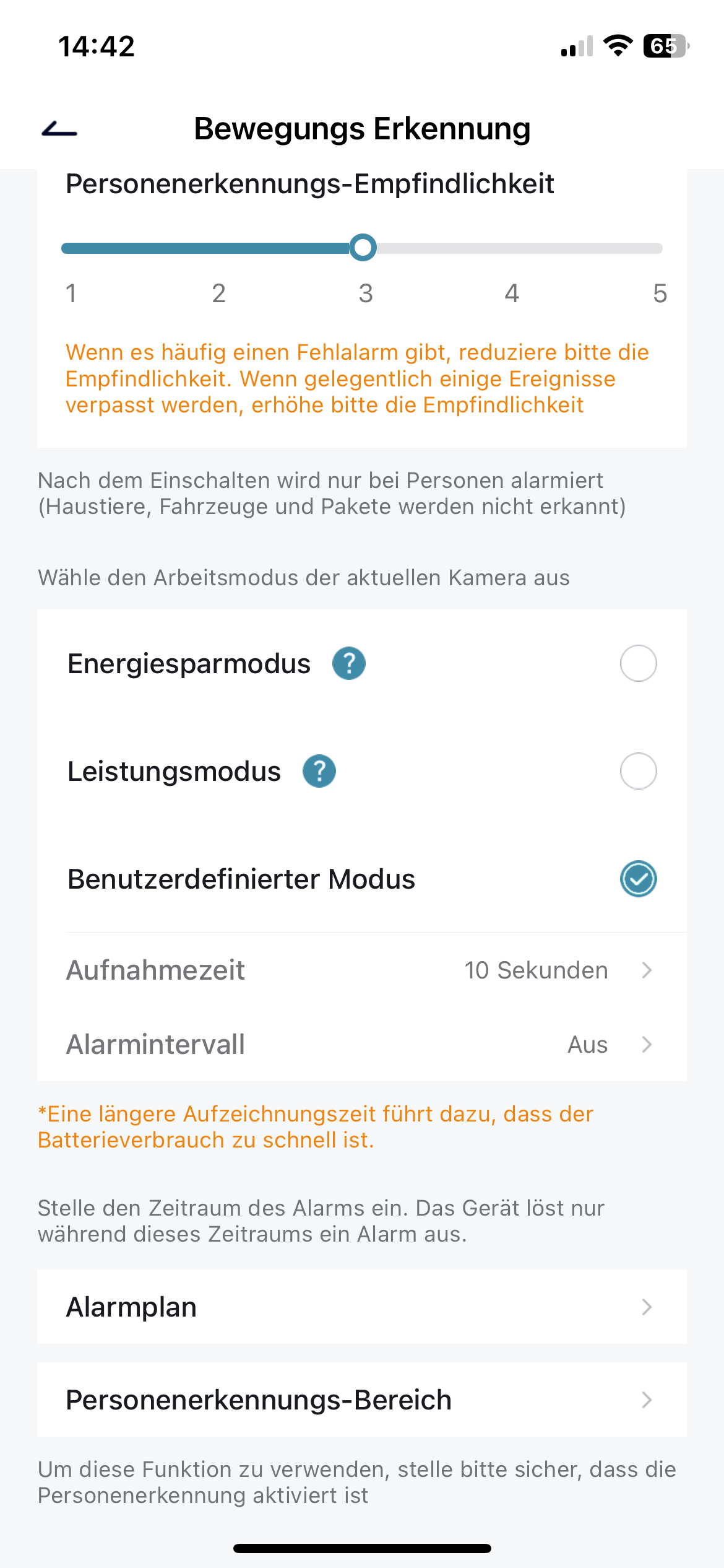 Außerdem kannst du noch Einfluss auf den Energieverbrauch deiner Kamera nehmen. Es gibt einen Energiesparmodus, einen Leistungsmodus sowie einen benutzerdefinierten Modus. Im Energiesparmodus ist beispielsweise die Aufnahmezeit des Videos sehr kurz, und die Personenerkennung ist aktiviert. Beides trägt dazu bei, möglichst wenig Energie in Anspruch zu nehmen.