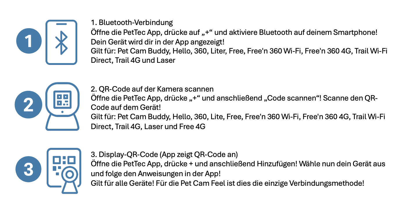 es gibt mittlerweile unterschiedliche Wege deine Pet Cam mit der PetTec App initial zu verbinden. Unser Ziel ist es aber, die Verbindungsmethode in Zukunft zu vereinheitlichen. Aktuell gibt es drei unterschiedliche Verbindungsmethoden die wir dir hier erläutern: