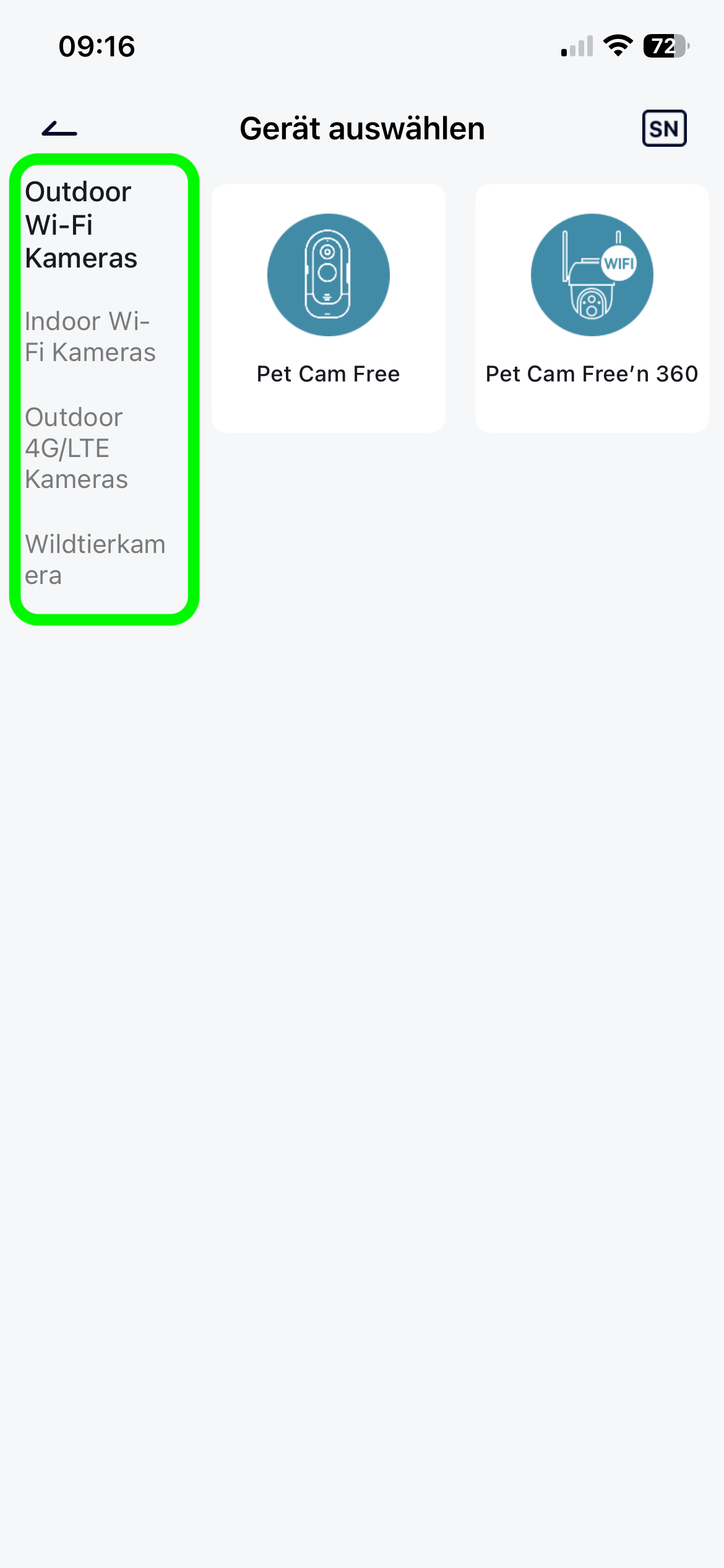 - Wähle nun auf der Seite "Gerät auswählen" dein Gerät aus der Liste aus und folge den weiteren Schritten in der App. Hinweis: Die Kameras sind in Kategorien unterteilt die du durchklicken kannst, um dein Gerät zu finden.