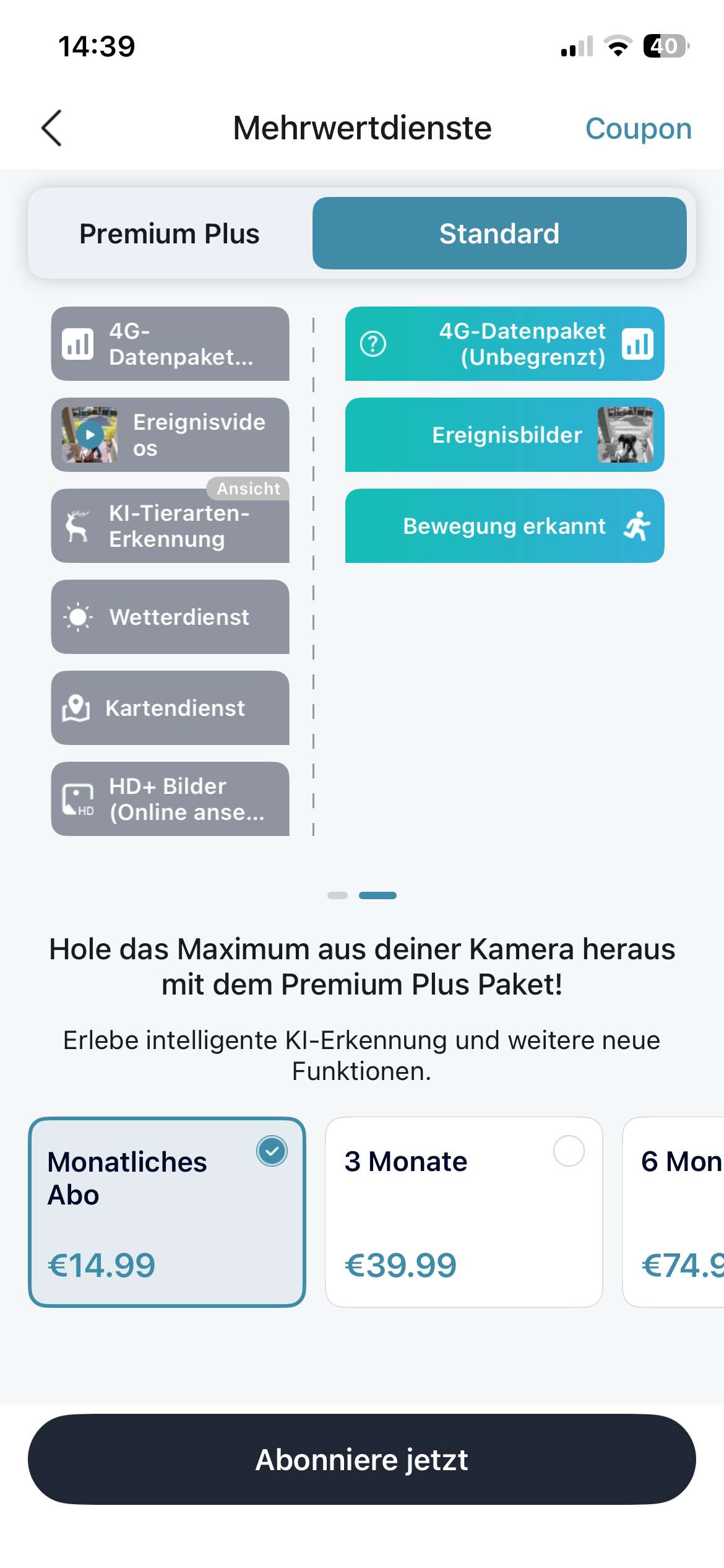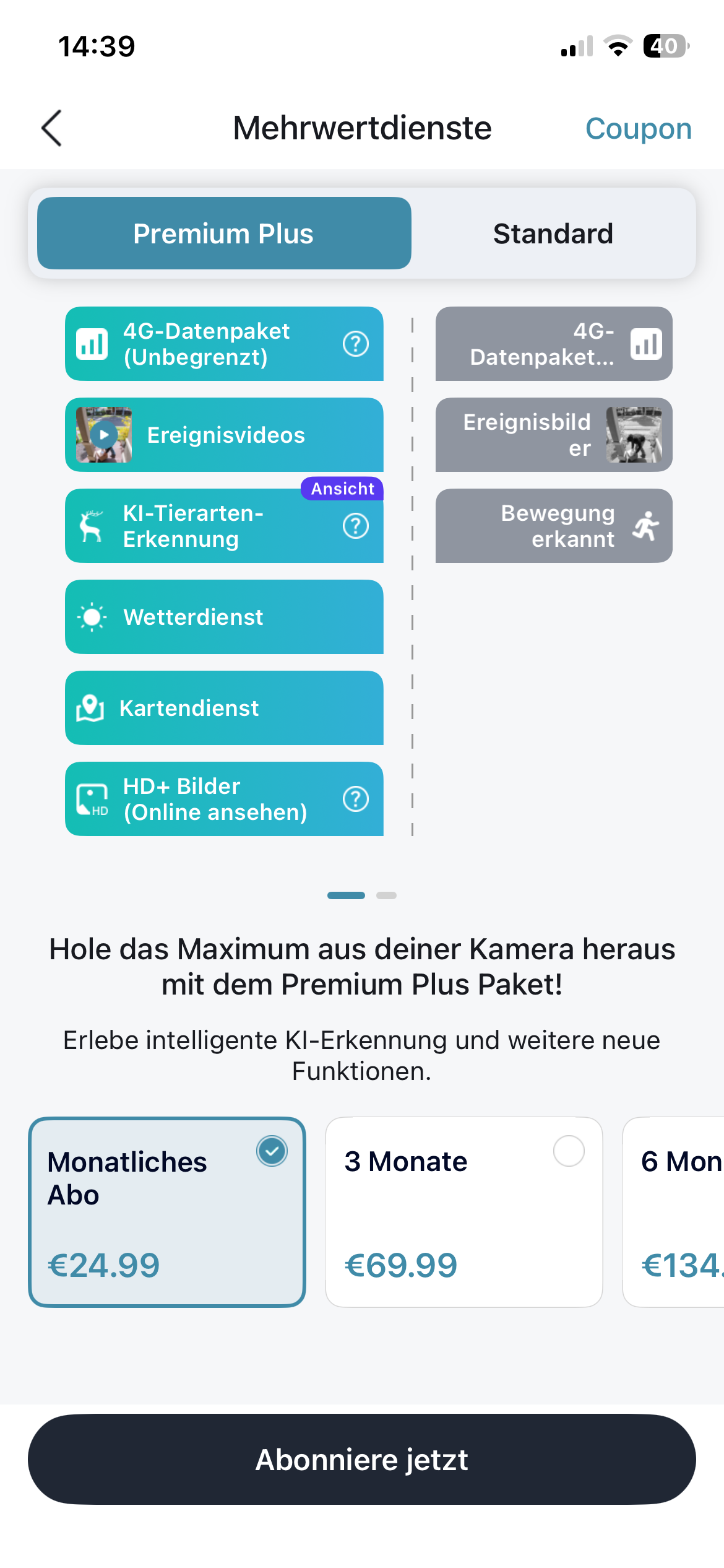 Es gibt den Premium Plus Service der sozusagen alles beinhaltet wie zum Beispiel den 4G/LTE-Service mit unbegrenzter Datenmenge, der Cloud Event Video Service (30 sekündliche Videos eines Events sowie den KI-Service, der dir eine Vielzahl an KI-Erkennungen bietet.