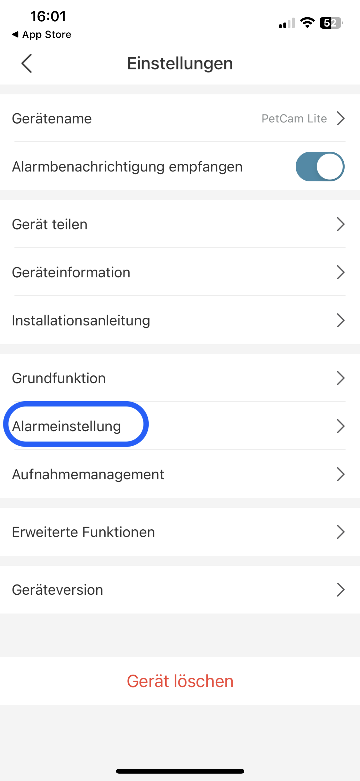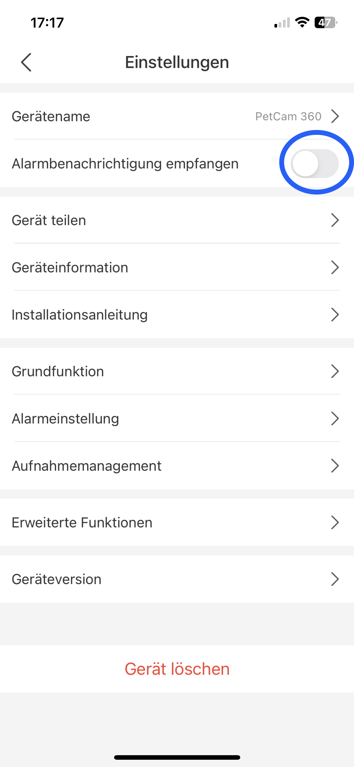 In der PetTec App kann der Empfang der Benachrichtigungen ebenfalls ein und ausgeschalten werden (siehe Screenshot darunter)! Der Empfang der Benachrichtigungen kann wie die Bewegungserkennung individuell für jede Kamera in den Kameraeinstellungen ein- und ausgeschaltet werden!