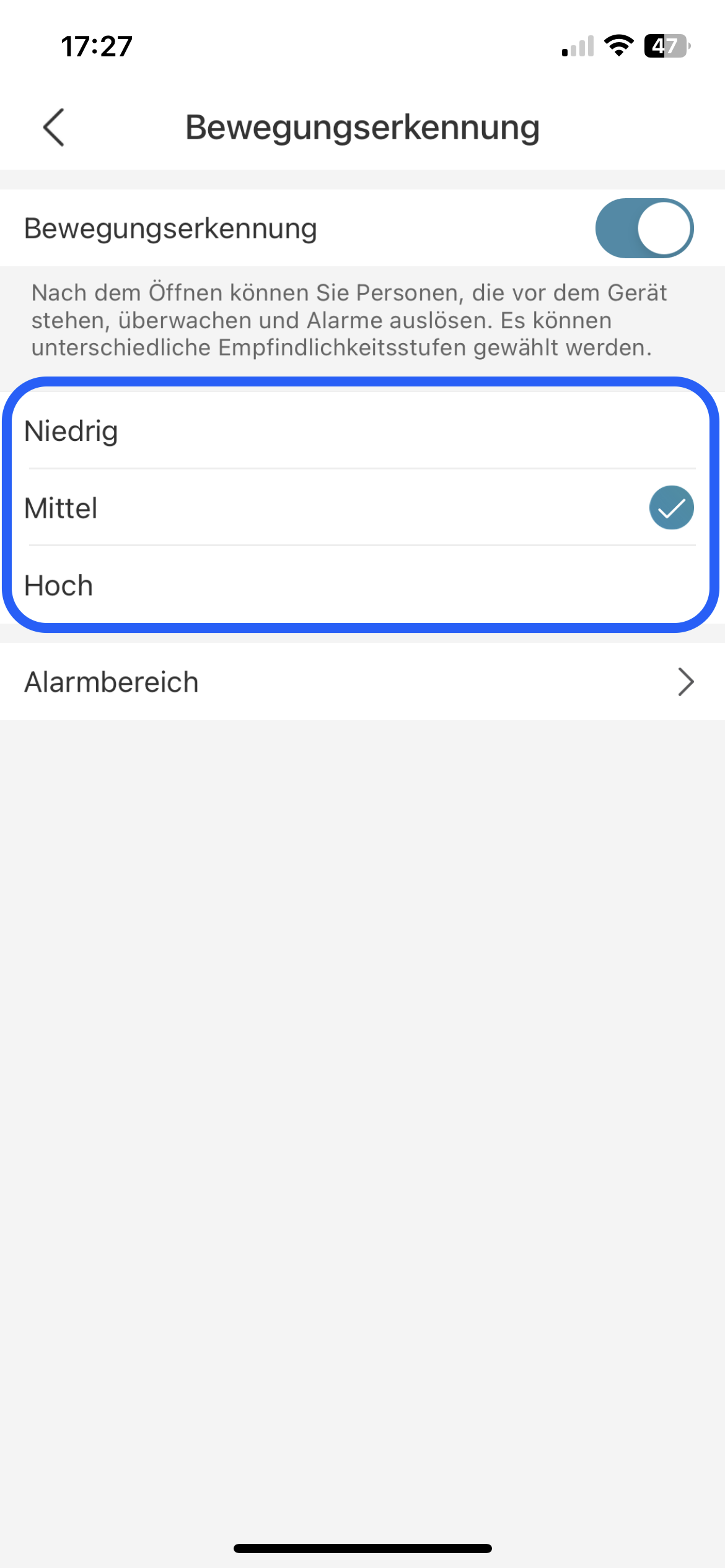 Schritt 5: Die passende Empfindlichkeitsstufe der Bewegungserkennung auswählen (Niedrig / Mittel / Hoch)