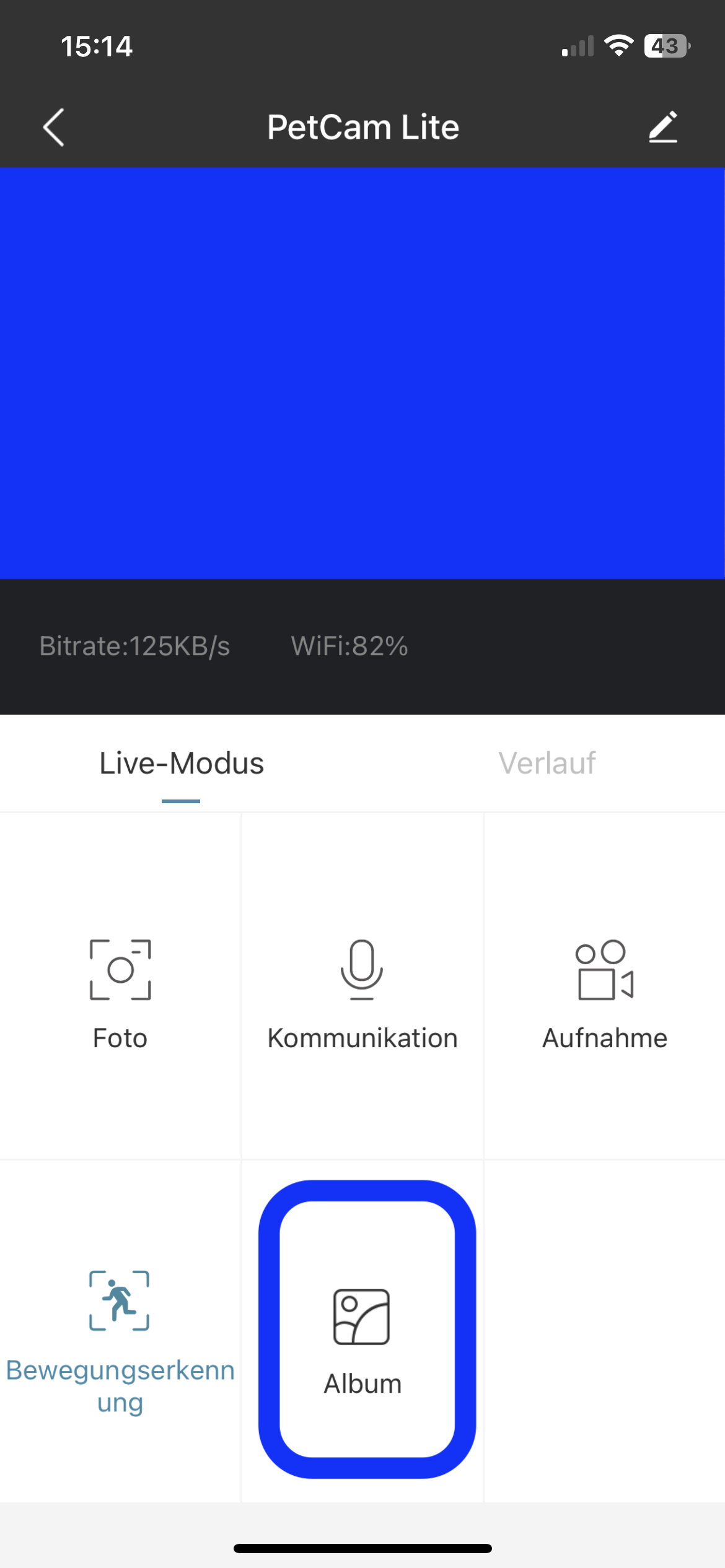 Die per Aufnahmefunktion (heißt, Videoaufnahme wurde manuell ausgelöst) erstellten Videos / Fotos sind in der PetTec Kamera App unter "Album" zu finden (siehe Bild darunter):