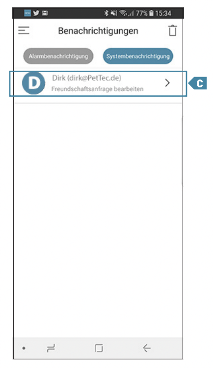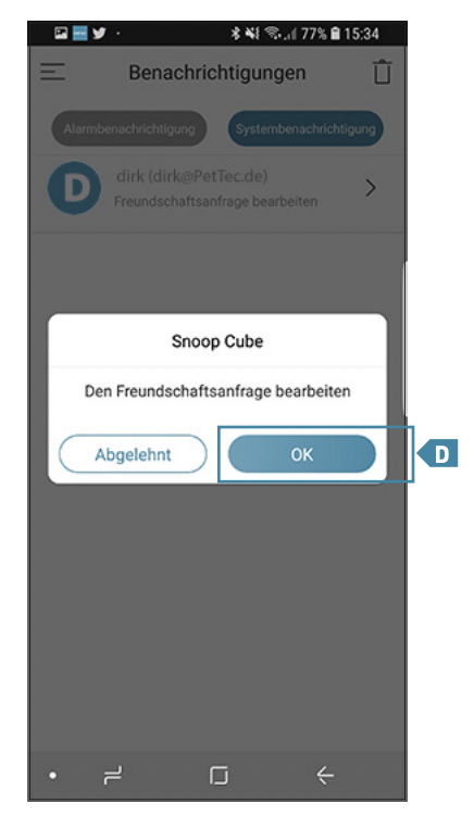 4. Anschließend öffnet sich eine Pop-Up-Benachrichtigung, in der die Freundschaftsanfrage zum Teilen/ Freigeben der PetTec Cam per Klick auf „OK“ akzeptiert wird!