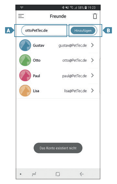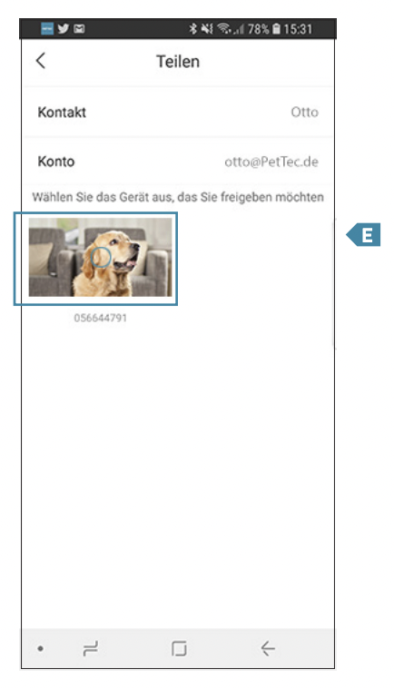 1. Um eine PetTec Kamera zu teilen / freizugeben, muss die Person, die man einladen möchte, sich selbst erst die App herunterladen und sich dort registrieren. Dann kann deren E-Mail im Feld „E-Mail“ eingetragen werden! Bitte achte darauf, dass nur bereits registrierte E-Mails verwendet werden können!