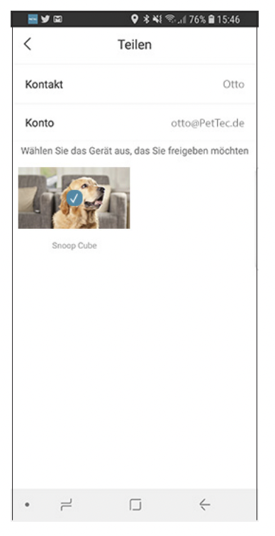 5. Nach Bestätigung durch die eingeladene Person kann eine mit der Snoop Cube App verbundene Kamera für diese Person freigegeben werden.